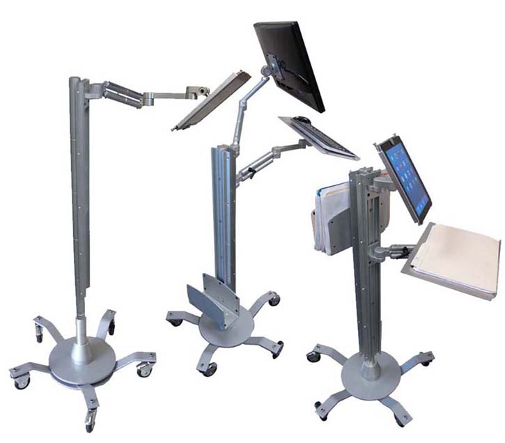 A sturdy, portable unit that allows you to attach tablets, monitors, laptops, keyboard and CPu holders onto the rail mount system.